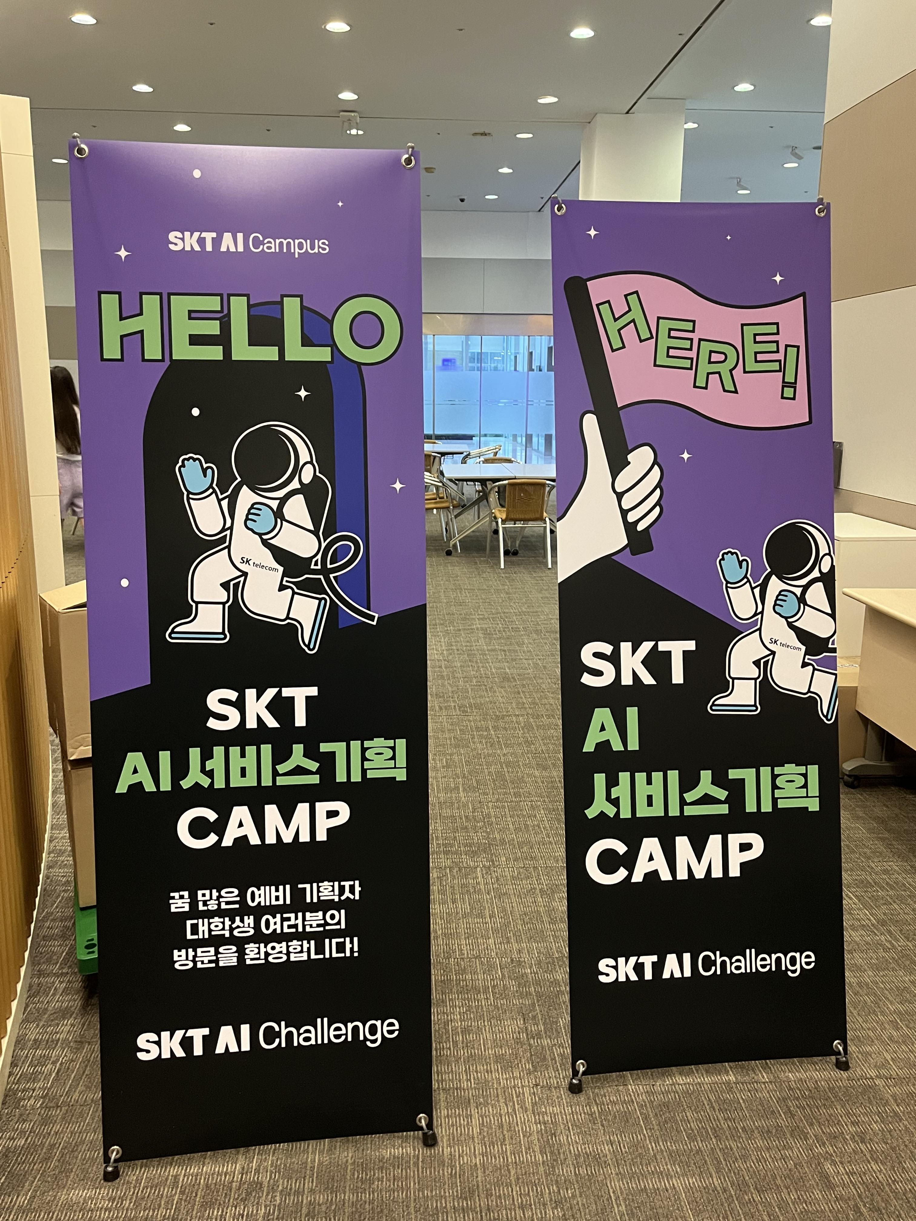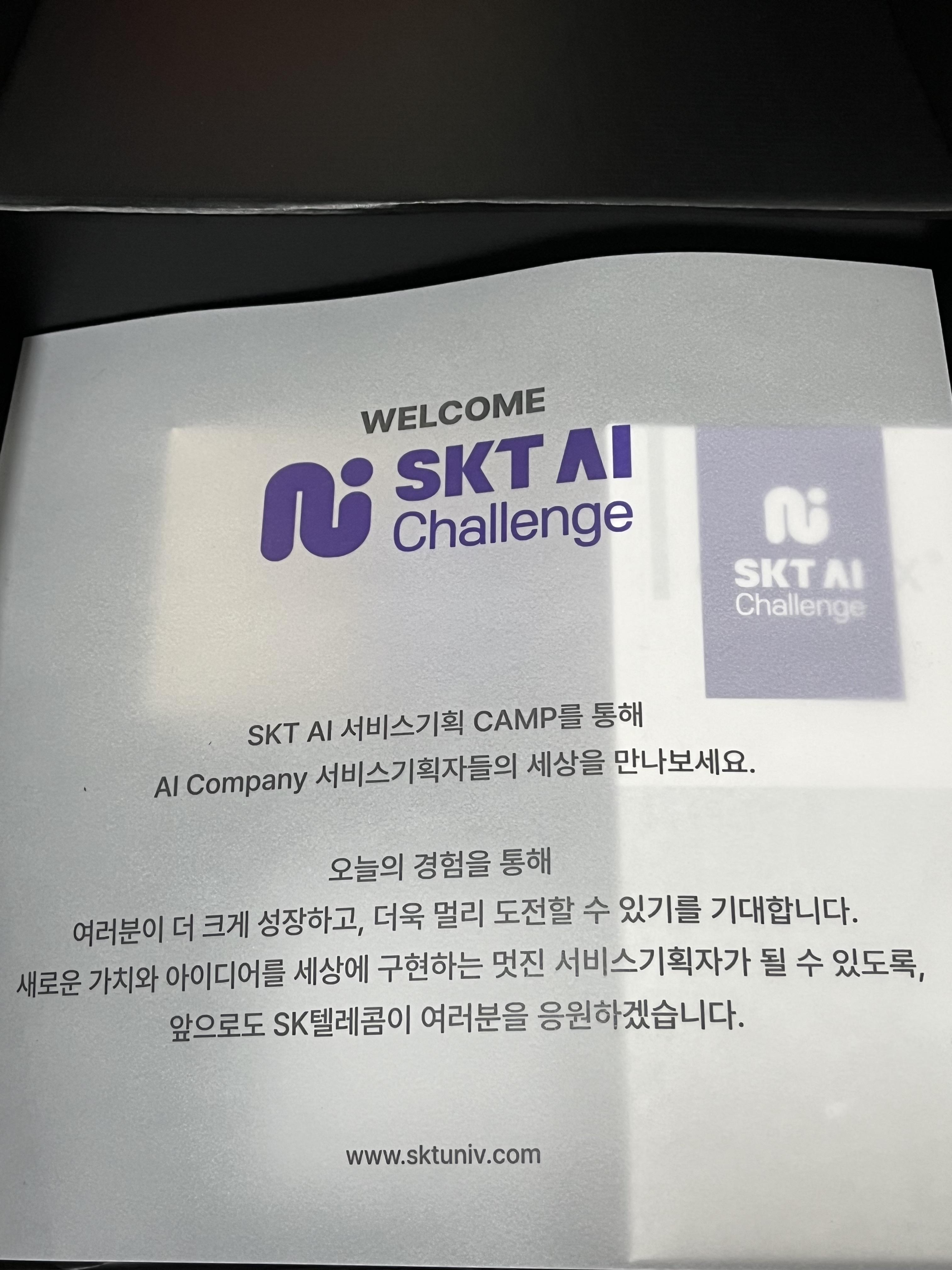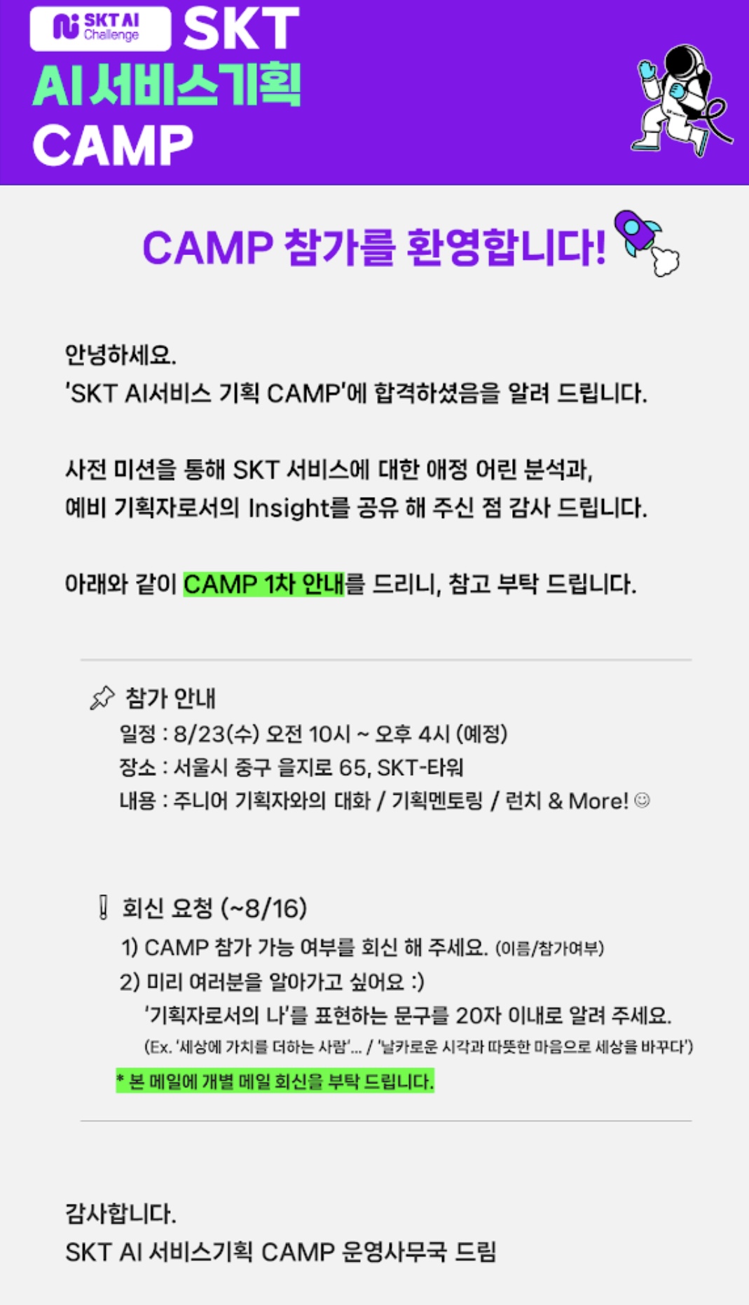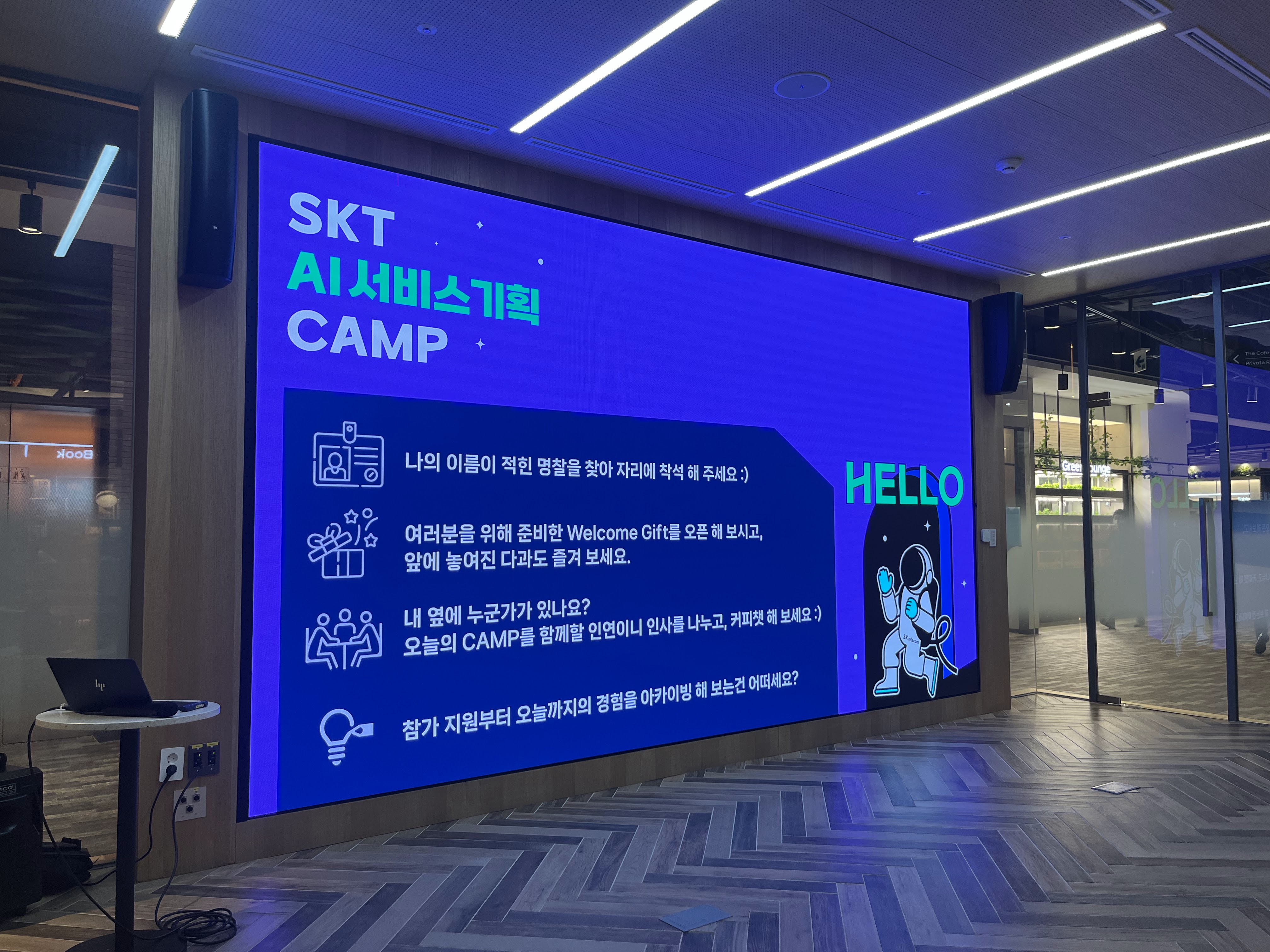 지난 학기까지 졸업 프로젝트로 AI를 공부하고 구현하며 인공지능에 관심이 많았던 나는 그동안 배운 AI기술을 어떻게 하면 기획에 잘 녹여낼 수 있을지 고민이 참 많았다. 이 타이밍에 SKT에서 AI서비스 기획 캠프를 열어주시다니! 이건 진짜 운명이 아닐 수 없다 🥹 심지어 단순 세미나 형태가 아니라 직접 SKT 사옥에 방문하여 현직자와 만나 뵙고 멘토링까지 받을 수 있는 뜻깊은 시간까지 준비되어 있다고 하니 앞으로의 나의 진로 방향을 결정하기에 좋은 경험이 될 것 같아 지원하게 되었다.