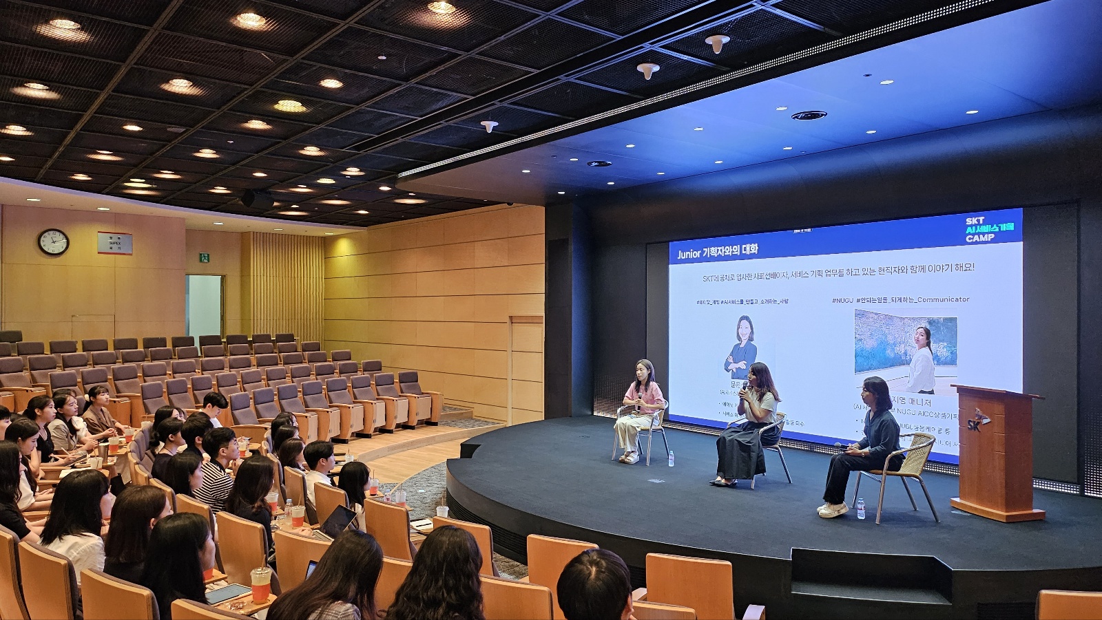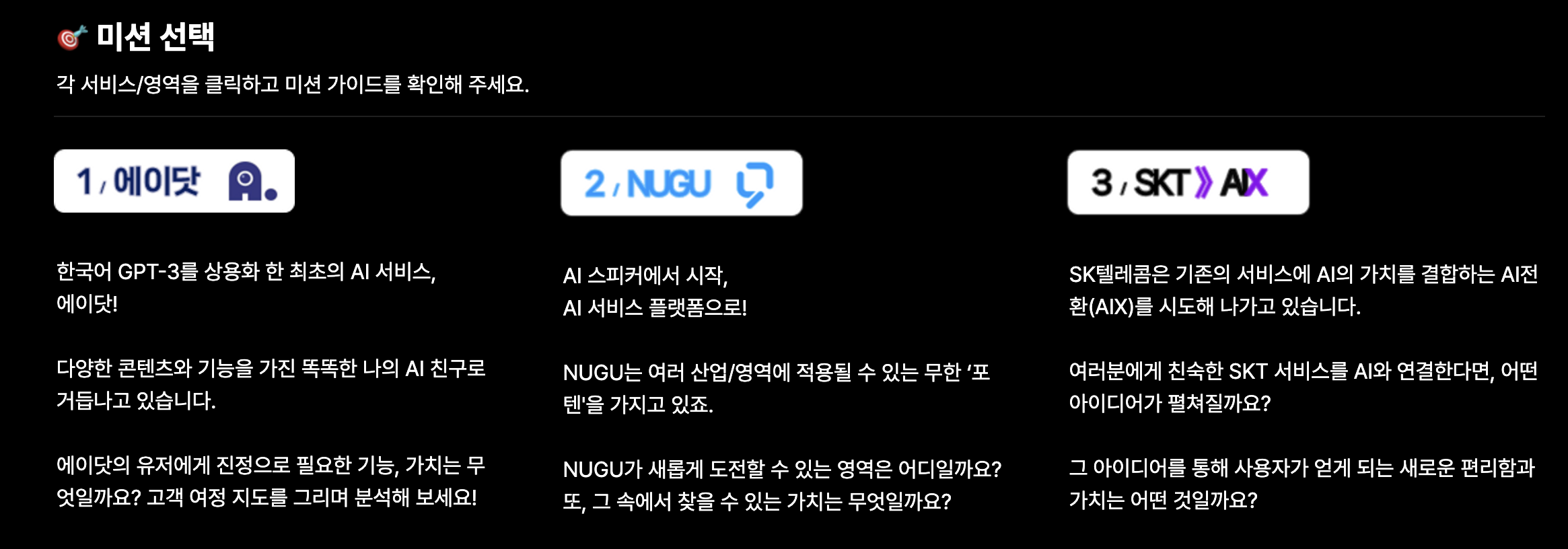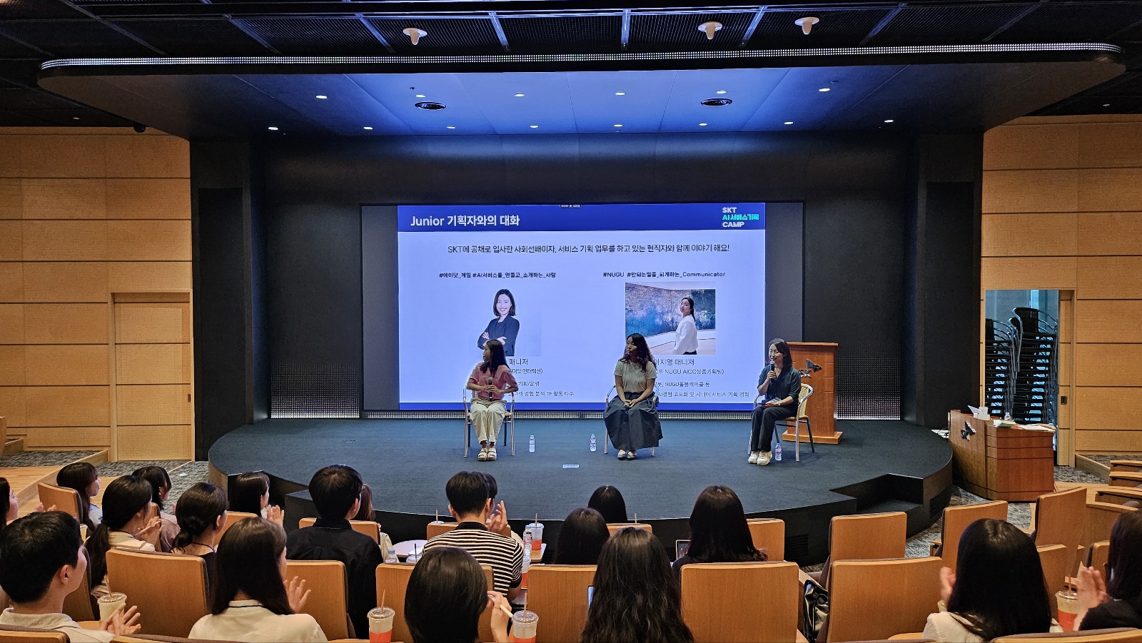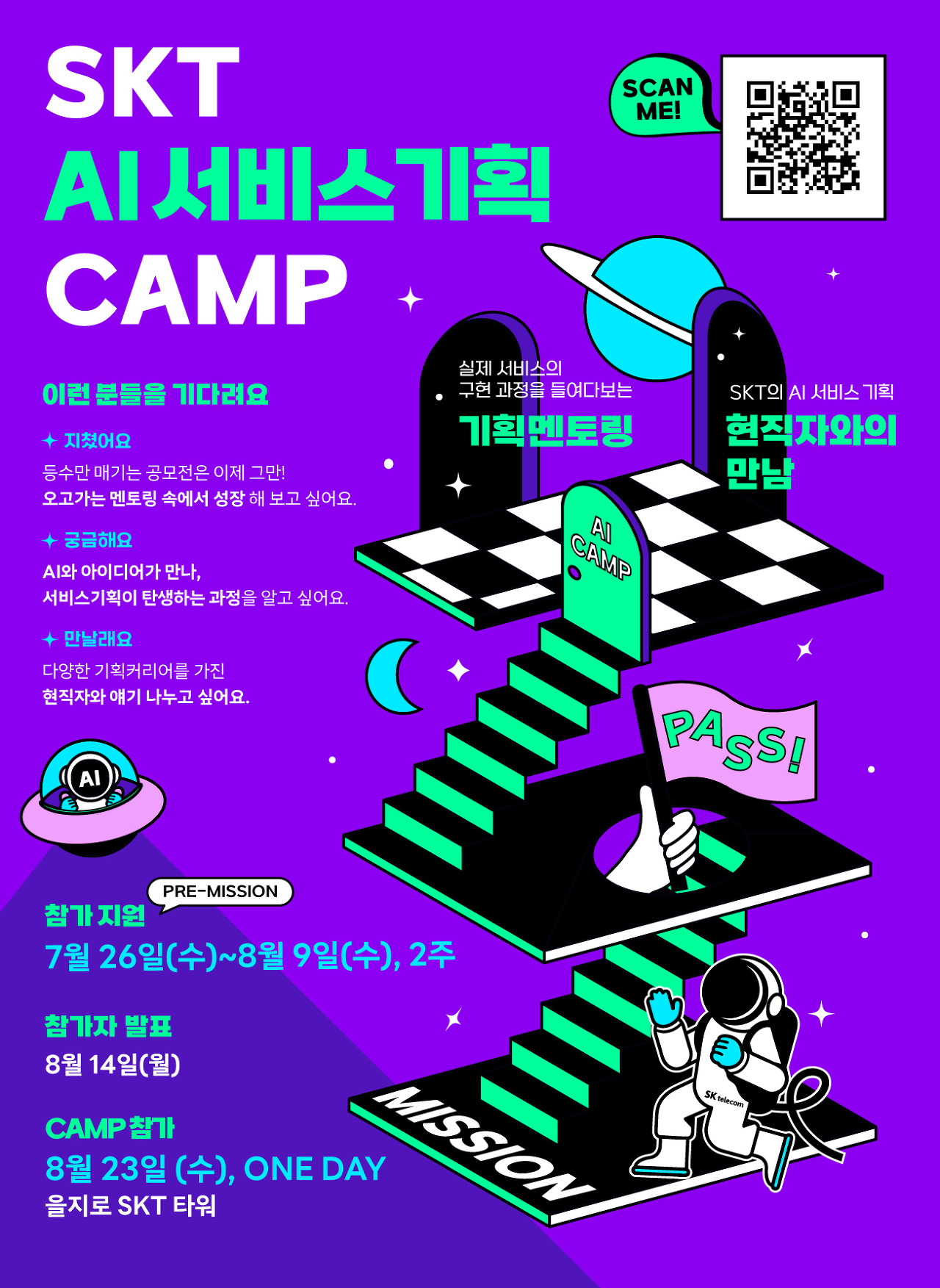 지난 학기까지 졸업 프로젝트로 AI를 공부하고 구현하며 인공지능에 관심이 많았던 나는 그동안 배운 AI기술을 어떻게 하면 기획에 잘 녹여낼 수 있을지 고민이 참 많았다. 이 타이밍에 SKT에서 AI서비스 기획 캠프를 열어주시다니! 이건 진짜 운명이 아닐 수 없다 🥹 심지어 단순 세미나 형태가 아니라 직접 SKT 사옥에 방문하여 현직자와 만나 뵙고 멘토링까지 받을 수 있는 뜻깊은 시간까지 준비되어 있다고 하니 앞으로의 나의 진로 방향을 결정하기에 좋은 경험이 될 것 같아 지원하게 되었다.