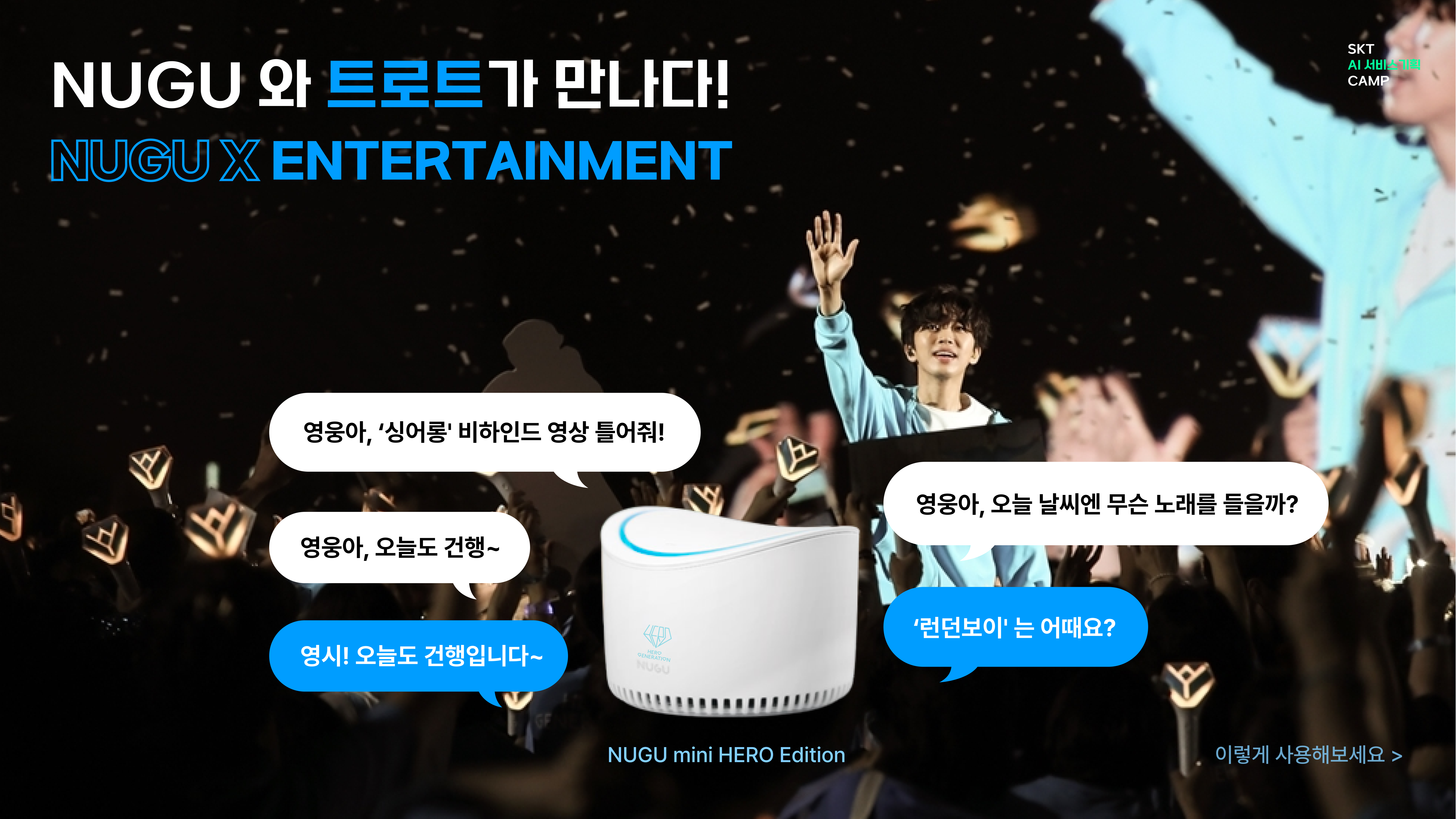기존의 NUGU의 특색을 잘 살릴 수 있는 분야 중 하나라고 판단하여 선정하였고 엔터테인먼트 산업이 완전히 '새로운 분야'라고 말하기는 어렵겠으나 엔터테인먼트 중에서도 트로트로 좀 더 분야를 세분화하여 아이디어를 풀어나갔다. 특히 NUGU에 탑재되어 있는 기능을 해당 분야에 활용하기에도 좋을 것 같다고 생각했다. 사실 사전 미션을 준비하면서도, 제출하는 그 마지막 순간까지도 이게 맞나 하는 생각에 확신이 들진 않았지만 기획하는 동안 재밌었기에 그걸로 만족하기로 했다.. ㅎㅎ
